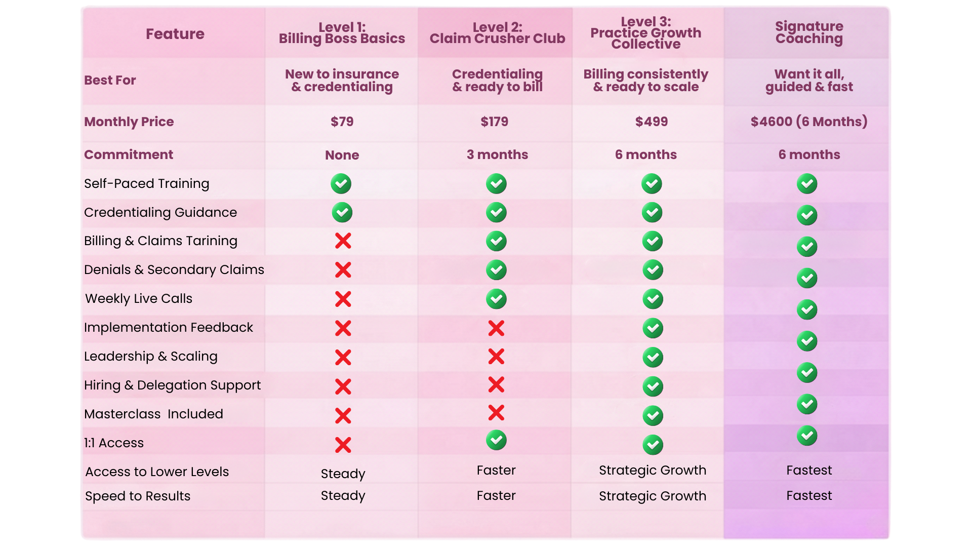 Understand exactly what's included in each tier so you can confidently choose the support that best fits of your current stage of your practice.